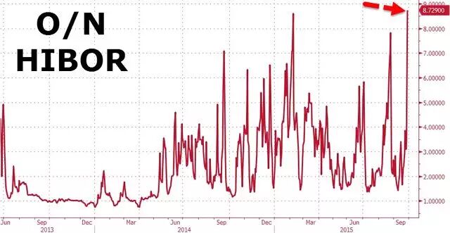 此外值得注意的是,周二早間,香港銀行間人民幣隔夜拆借利率(Hibor)已經(jīng)升至8.73%,為2013年6月開始推出定盤價以來的最高。就在上周五這一利率水平還是3.38%。周一香港市場假期休市。